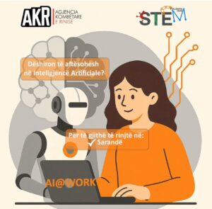 AI@Work është një nismë edukuese inovative.Synon të rinjtë 15–29 vjeç në Tiranë, Korçë dhe Sarandë.Projekti realizohet nga Qendra STEM Hub Mbështetur financiarisht nga Agjencia Kombëtare e Rinisë (AKR).